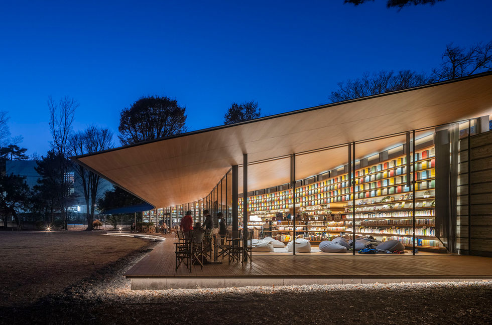 Located amidst the abundant nature of Musashino-no-mori Park, this building is a library comprising a large, steeply sloped shed roof, a deck and full-length wall bookshelves. In this library, the books are illuminated by lights installed in the bookshelves, and that lighting creates brightness for the space. For the ceiling lighting, the selection of unobtrusive lighting fixtures—and a drastic reduction in their number—has eliminated visual noise on the ceiling surface. Furthermore, floor lights and downlights have been used to ensure the minimum light necessary for reading spaces.